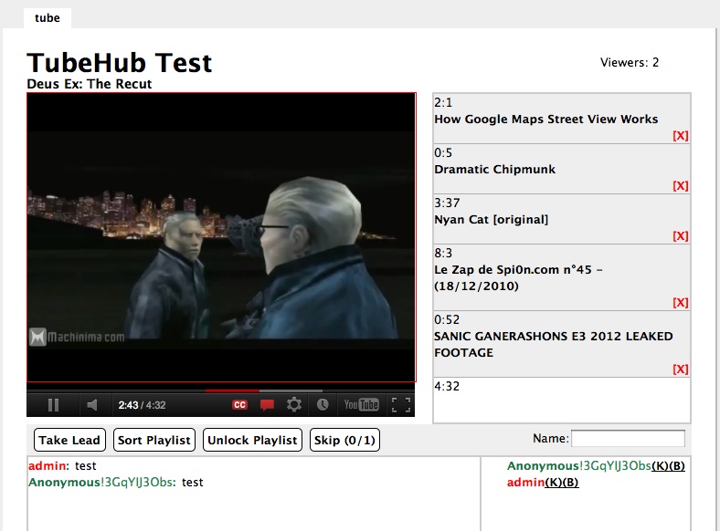 Why? well after using Synchtube for a while, I found the only thing I was interested in was the sharing and discovery of videos, not the excessive point scoring by the community. I also noticed a general hostility to users without user accounts, which to me detracted from the experience of watching cool videos. By making everyone anonymous by default I hoped to emphasise the viewership aspect.